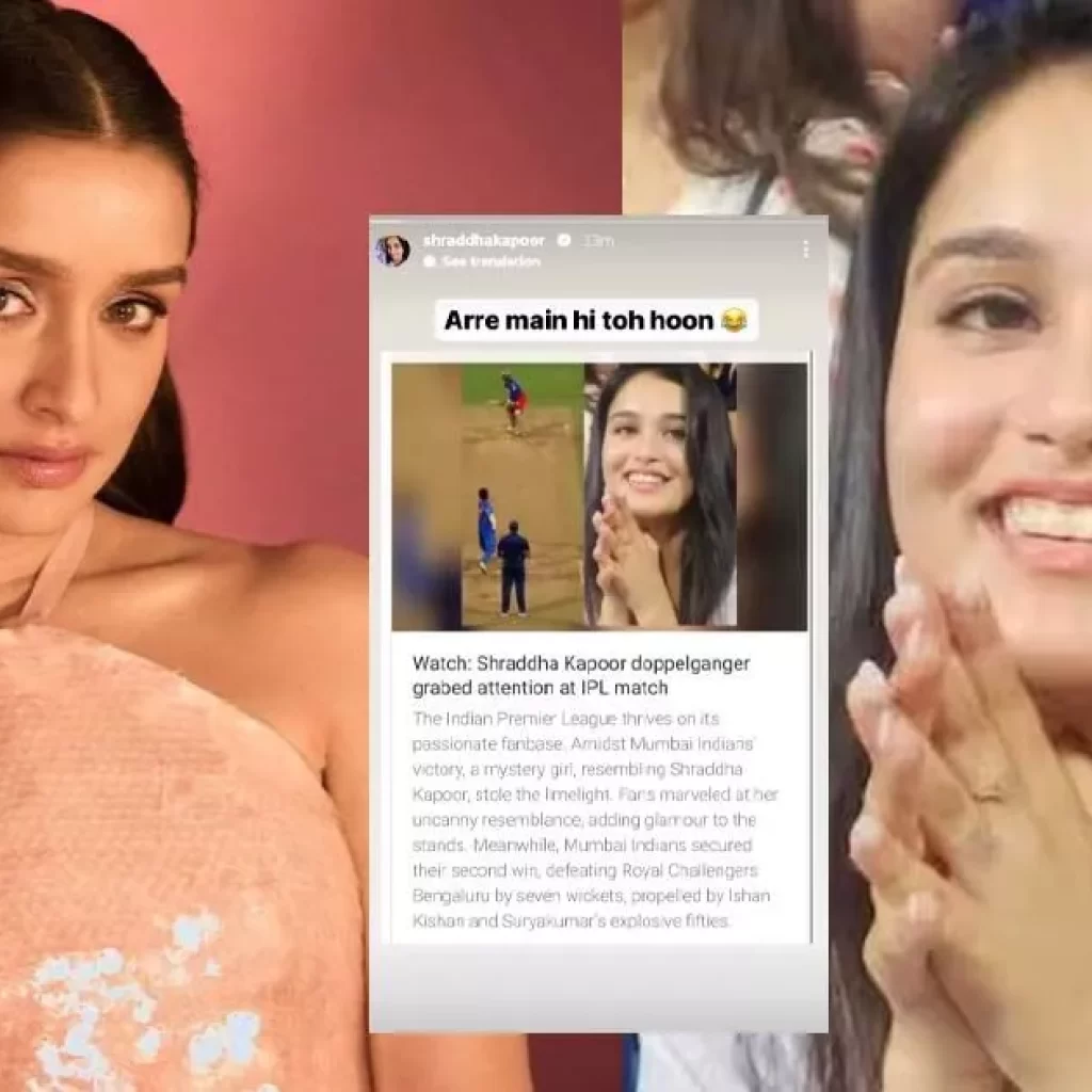 બોલિવૂડ અભિનેત્રી શ્રદ્ધા કપૂરે હાલમાં જ તેની ઈન્સ્ટા સ્ટોરી પર એક તસવીર શેર કરી છે, જે IPL મેચ દરમિયાન લેવામાં આવી હતી. આમાં એક છોકરી જોવા મળે છે જે બિલકુલ શ્રદ્ધા કપૂર જેવી લાગે છે. શ્રદ્ધાએ પણ આ પોસ્ટ કરી અને લખ્યું- અરે.. તે હું છું. આઈપીએલ મેચ દરમિયાન કેમેરામેન મોટાભાગની સુંદર છોકરીઓને તેમના રૂમમાં કેદ કરીને આઈપીએલની મોટી સ્ક્રીન પર બતાવે છે, જેમાંથી કેટલીક છોકરીઓ એવી હોય છે કે તેઓ રાતોરાત સનસનાટીભર્યા બની જાય છે. એવી જ રીતે શ્રદ્ધા કપૂર જેવી દેખાતી આ છોકરી પણ સોશિયલ મીડિયા પર પોપ્યુલર થઈ ગઈ છે અને યુઝર્સ તેને શ્રદ્ધા કપૂરની કાર્બન કોપી પણ કહી રહ્યા છે.