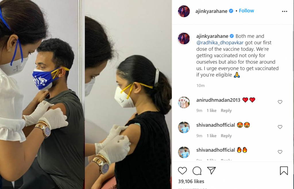 અજિંક્ય રહાણે પહેલા શિખર ધવનને શુક્રવારે કોરોના રસીનો પ્રથમ ડોઝ પણ મળ્યો હતો. બંને ખેલાડીઓ આઈપીએલ 2021 માં દિલ્હી કેપિટલ ટીમનો ભાગ હતા.
