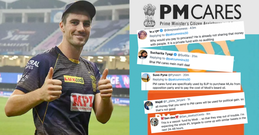 ઇન્ડિયન પ્રીમિયર લીગ 2021માં કોલકાતા નાઈટ રાઇડર્સ ફ્રેન્ચાઇઝી ટીમ તરફથી રમતા ઓસ્ટ્રેલિયાના ઝડપી બોલર પેટ કમિન્સે સ્પષ્ટ કર્યું છે કે તેણે કોવિડ -19 રોગચાળો સામેના યુદ્ધને સમર્થન આપવા માટે ભારતને આ રકમ દાનમાં આપી છે. પરંતુ તેને પીએમ કેયર્સ ફંડમાં આપ્યું નથી. કમિન્સ જણાવ્યું હતું કે તેમણે યુનિસેફ ઓસ્ટ્રેલિયાની ભારત કોવિડ-19 કટોકટી અપીલ માટે 50 હજાર ડોલર દાન આપ્યું છે.