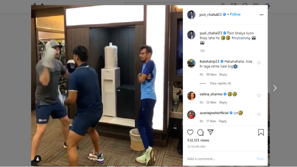 જોકે, ચહલને વિડિયોમાં જોતાં એવું લાગે છે કે, તે વધુ ડાન્સ સ્ટેપ્સ કરી રહ્યો છે બોક્સિંગ કરતાં. તો એવામાં ચહલે, વીડિયોને કેપ્શન આપતા કહ્યું, “પંત ભૈયા કેમ થાકી રહ્યા છો.”