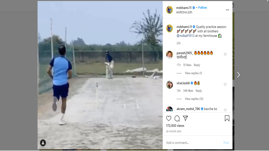 તો, શમીએ તેના ટ્વિટર એકાઉન્ટ પર ટ્વિટ કરીને કેપ્શનમાં લખ્યું હતું કે, “મારા ફાર્મહાઉસ હાઉસના ક્રિકેટ બેટ અને મારા ભાઈઓ સાથે ક્વોલિટી પ્રેક્ટિસ સેશન કરી રહ્યું છું.. આ વિડિયોમાં શમી, બોલિંગ કરતો નજરે પડે છે. અને તે પોતાની જાતને ફિટ કરવા માંગે છે એટલે તે દિવસ ને દિવસે ક્રિકેટ પ્રેક્ટિસના વિડિયો મૂકતો હોઈ છે. તે પોતાની ફિટનેસને ફરીથી સંપૂર્ણ બનાવવાનો પ્રયાસ કરી રહ્યો છે. જે બાદ ચાહકોએ તેની પ્રશંસા કરી હતી.