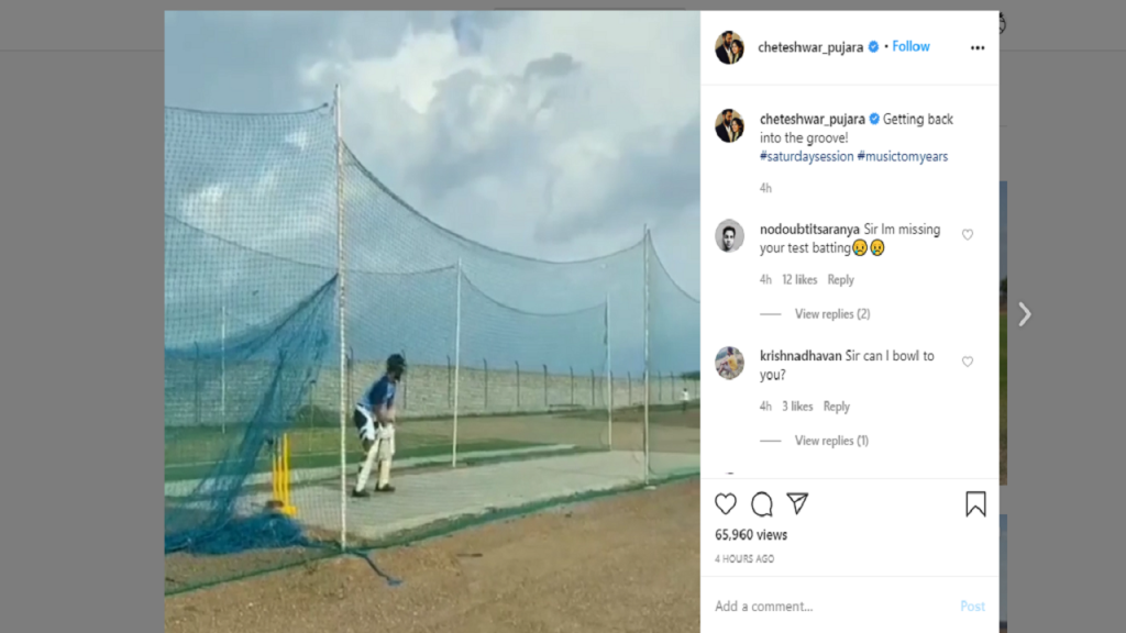 પૂજારાએ શનિવારે સોશિયલ મીડિયા પર એક વીડિયો પોસ્ટ કર્યો, જેમાં તે નેટ પર બેટિંગ કરતો જોવા મળી રહ્યો છે. તેમણે ટ્વિટર પર પોસ્ટ કરેલા આ વીડિયોમાં કહ્યું કે, હું ફરીથી લયમાં આવી રહ્યો છું.